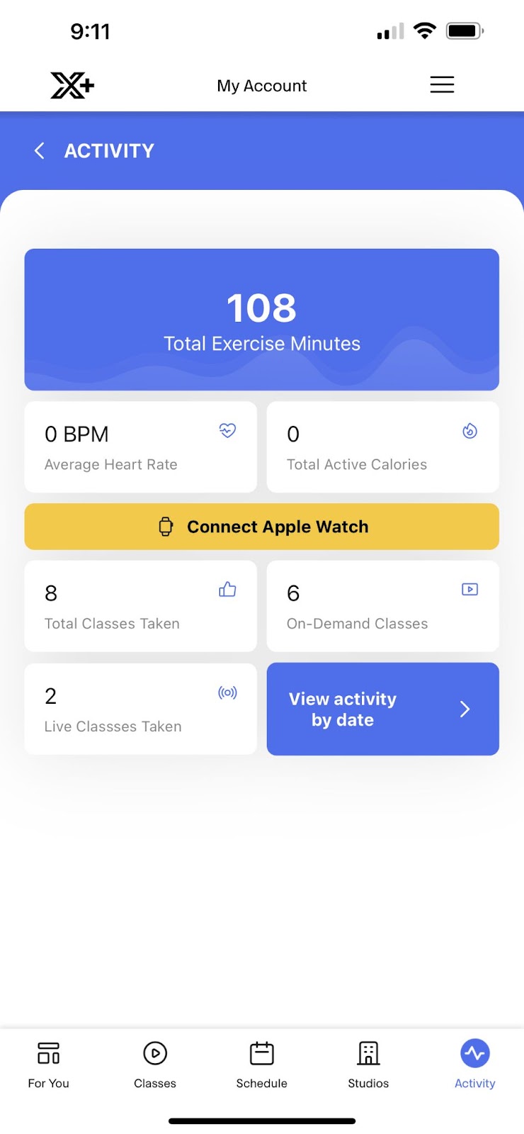 Open the XPLUS app on your phone & select the ACTIVITY icon in the bottom right corner of the home screen.